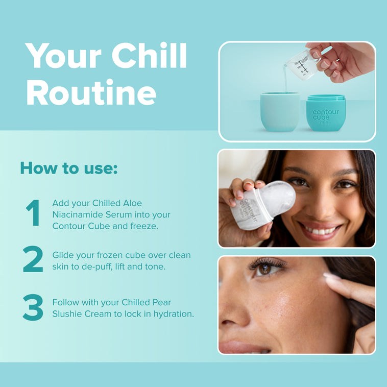 Pour 10ml-15ml of serum into your Contour Cube, add water until it is 90% full, then freeze over night. Apply to a cleansed face in circular motions for up to 1 minute, pat dry with your Ice Facial Towel, and follow with your Chilled Pear Slushie Cream.
