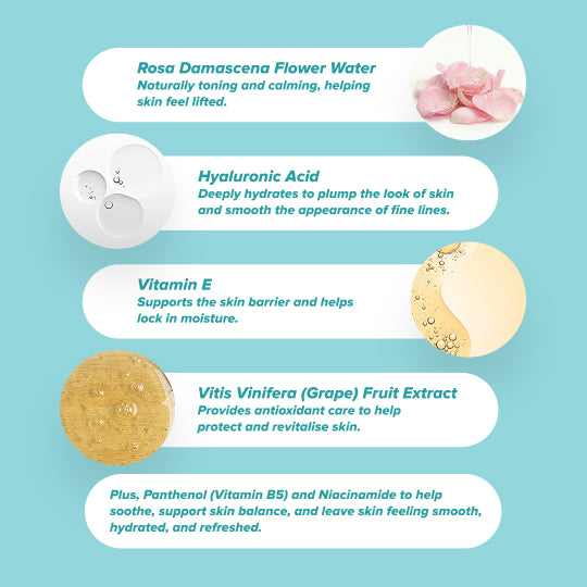 Water (Aqua), Butylene Glycol, Glycerin, Propanediol, 1,2-Hexanediol, Niacinamide, Panthenol, Caffeine, Polyglyceryl-10 Laurate, Glyceryl Acrylate/Acrylic Acid Copolymer, Ethylhexylglycerin, Arginine, Carbomer, Xanthan Gum, Sodium Hyaluronate, Pantolactone, Tocopherol, Rosa Damascena Flower Water, Vitis Vinifera (Grape) Fruit Extract, Disodium EDTA, Fragrance (Parfum), Geraniol, Citronellol, Hexyl Cinnamal, Limonene, Alpha-Isomethyl Ionone, Linalyl Acetate, Tetramethyl Acetyloctahydronaphthalenes
